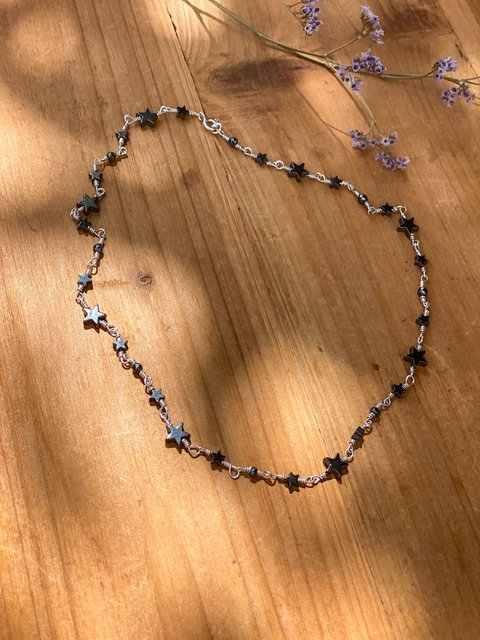 Feito artesanalmente em prata 925 e hematitas lapidadas em formato de estrelas de diferentes tamanhos e mini esfera facetada.